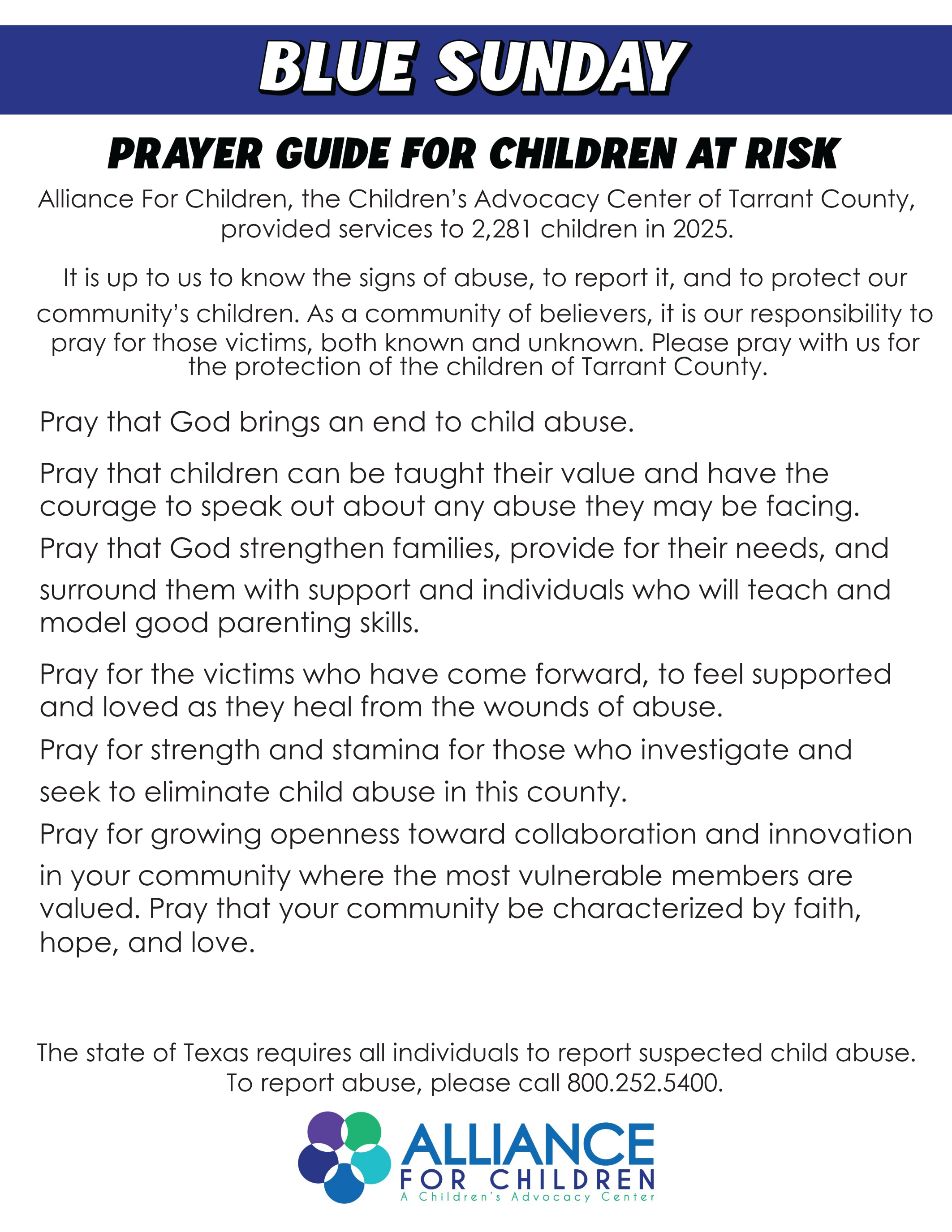 - Friday, April 10 - Wear BLUE Day. Wear your best BLUE, snap a photo, and share your passion via social media! Don't forget to tag Alliance For Children.